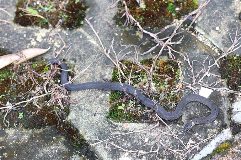 同时,科研人员在实验区开展日常野外巡护时发现了钝尾两头蛇。此次发现的钝尾两头蛇是一种罕见无毒蛇类,体长约30厘米,因其尾部的斑纹、形状、粗细与头部相似,且有相似的黄色斑而得名,多发现于海拔300米左右的山丘,以蚯蚓为食,其穴居习性表明当地土壤健康状况良好。
